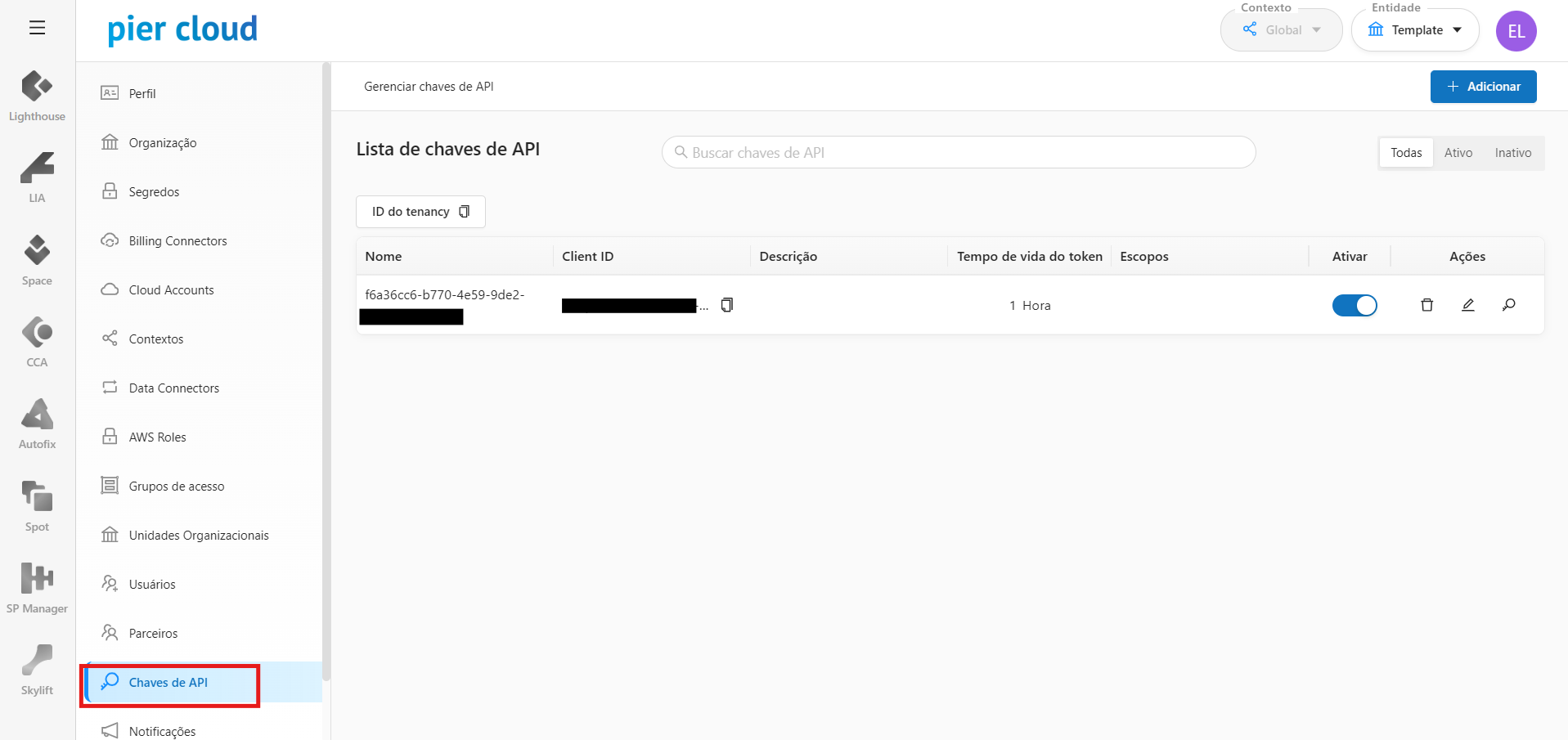 Uma funcionalidade desenvolvida pela Pier Cloud que permite criar chaves para integrar o ambiente do cliente com a API de serviços da Pier Cloud.