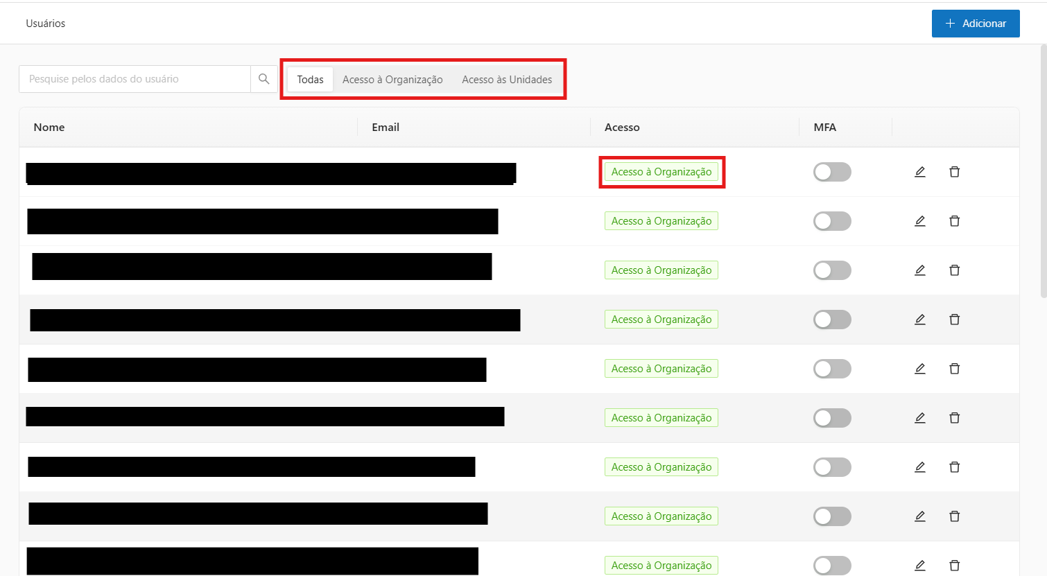 3. Na tela principal, o sistema permite visualizar os usuários cadastrados , verificar as unidades que o usuario tem acesso e adicionar novos usuários clicando no botão "**Adicionar**":