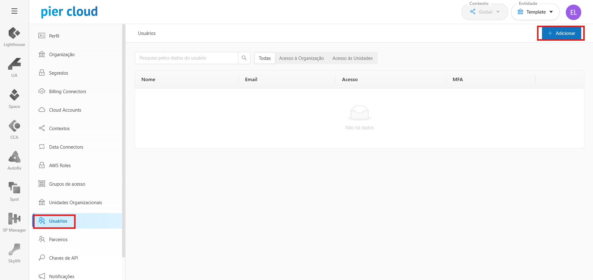 Para mais informações sobre os perfis de acesso, clique [**aqui**](https://docs.piercloud.com.br/finops-platform/acessos/politicas-de-acesso-e-permissoes)**!**