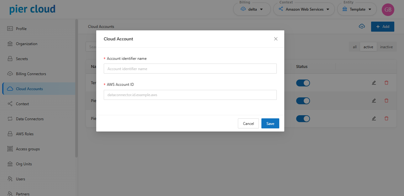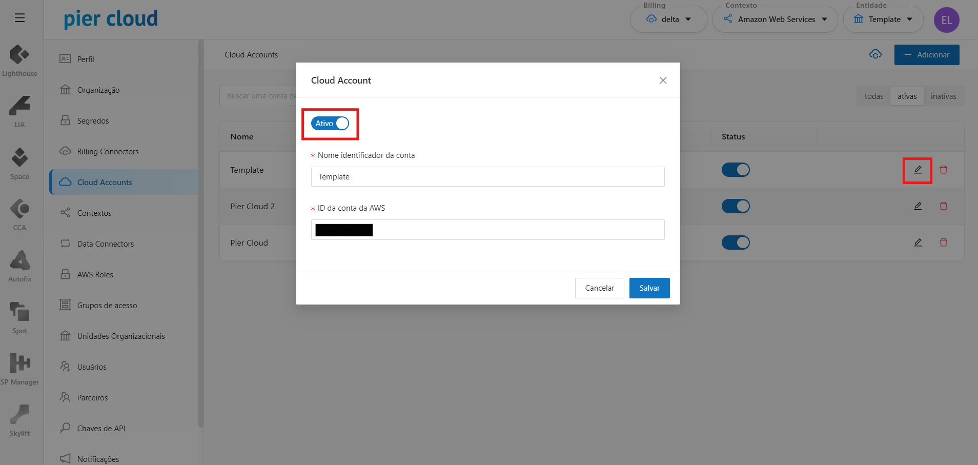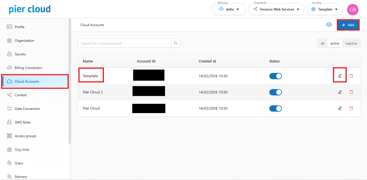 Additionally, it is possible to edit a cloud account and verify its status, whether active or inactive.