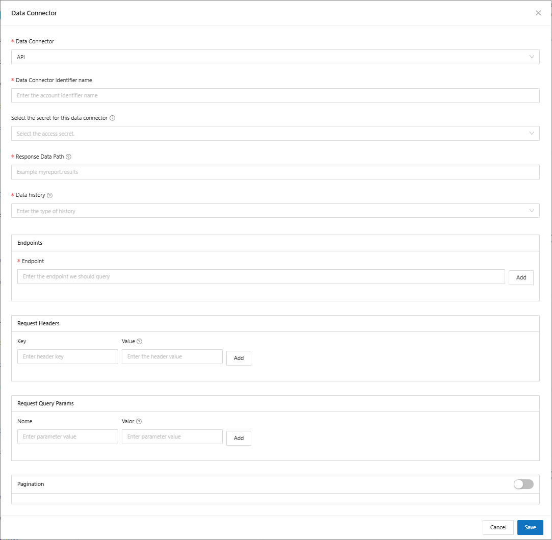 For each Data Connector option available on the platform, the system will present some additional fields to be filled in.