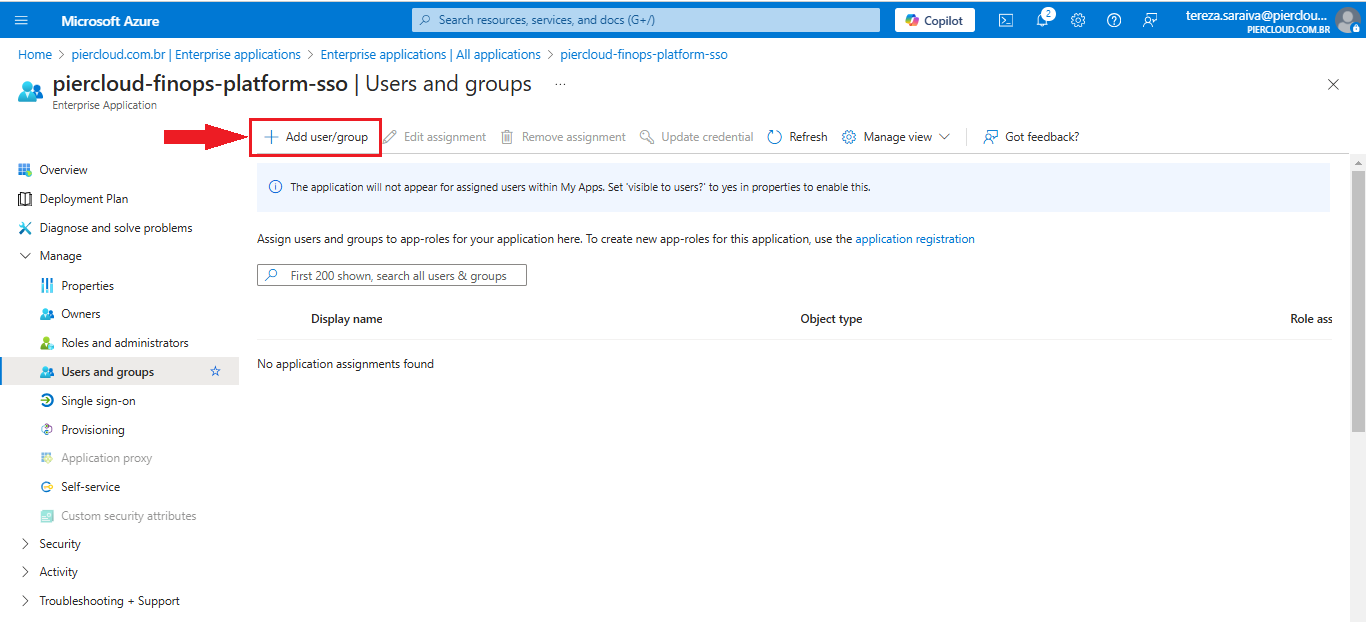 22. Click on **+ Add user/group** to select the groups that will have access to the application, as shown in the image below.