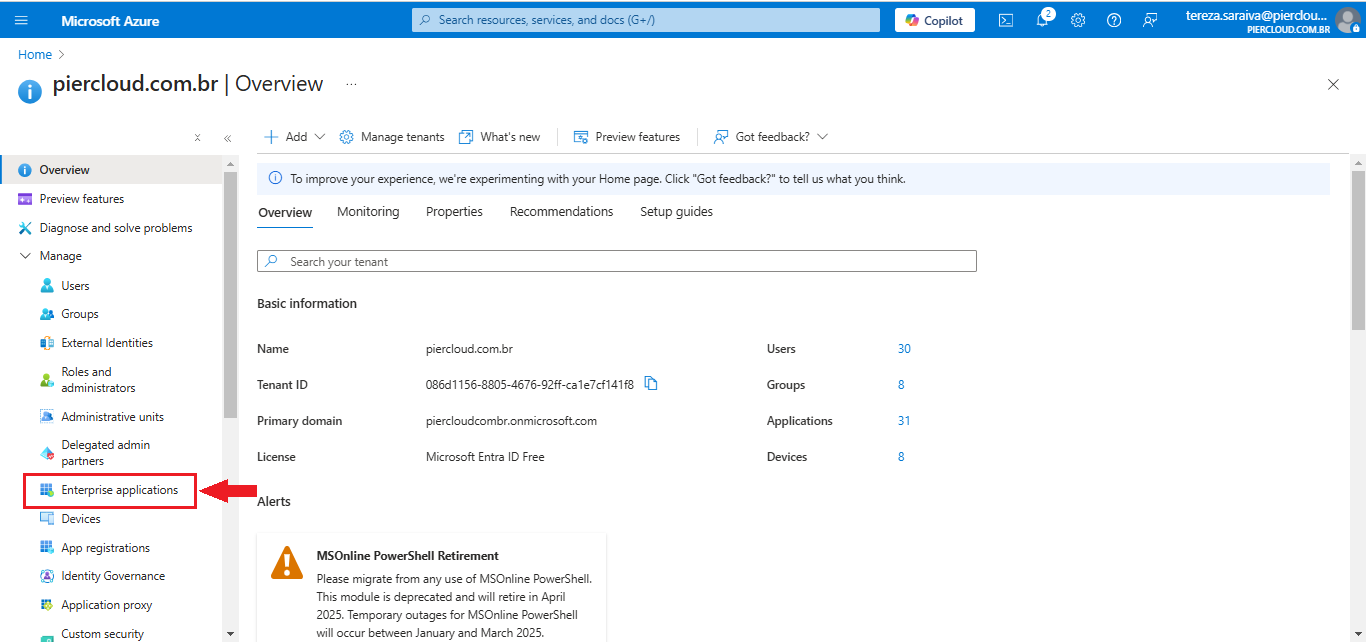 19. Here click on **Enterprise Applications**, in the bottom left menu, as illustrated in the image below