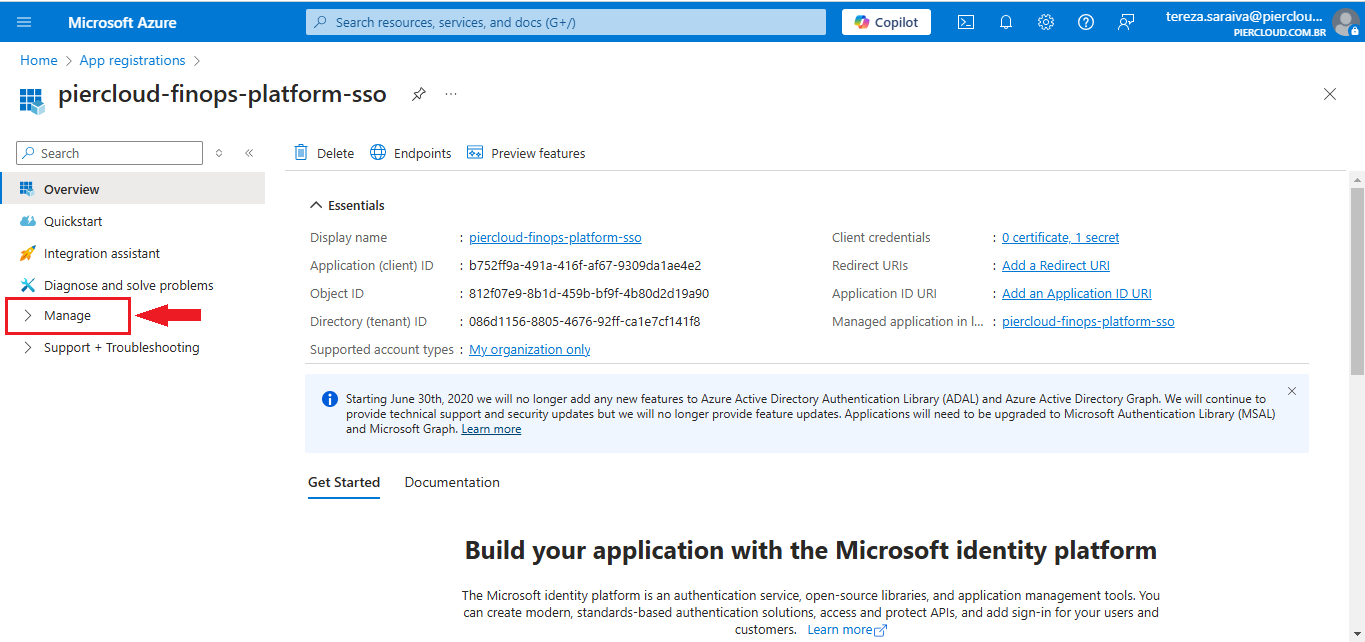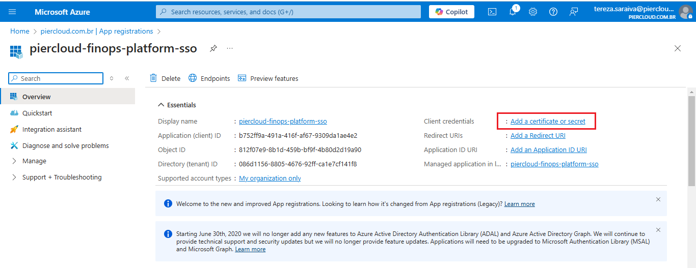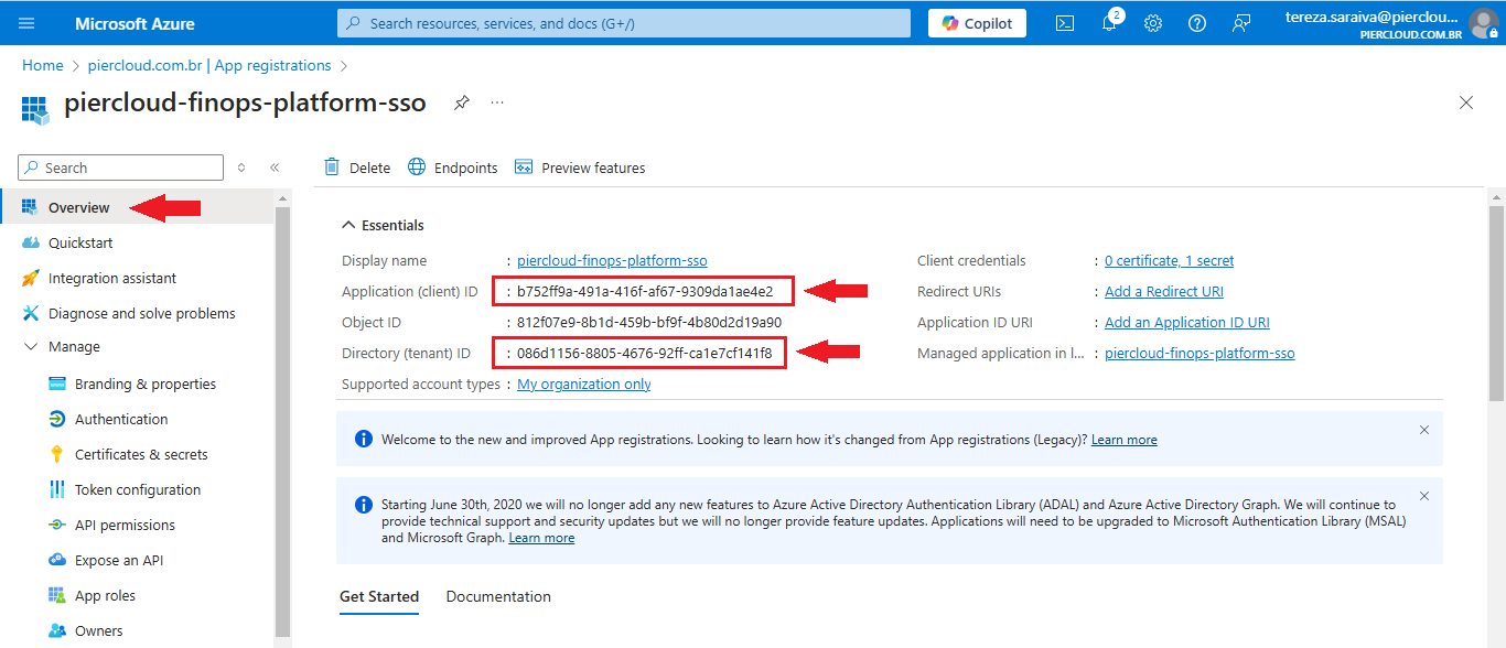 8. Click on Overview and send the **Application (client) ID** and **Directory (tenant) ID** to PierCloud team.