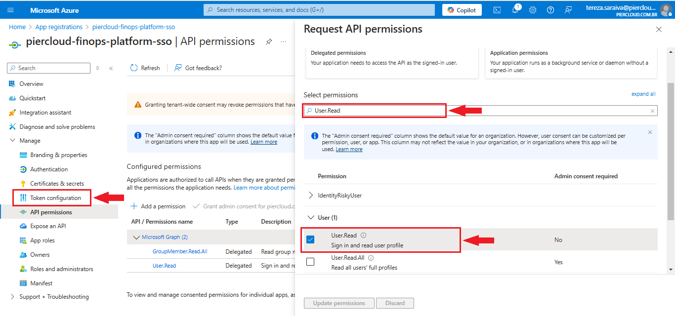 14. In the same window as the previous step, in the "**Select permissions**" field, look for **User.Read**, as illustrated in the image below. Make sure you select the correct permission, as there are similar options. After this process, in the bottom left menu, click on **Token configuration**.