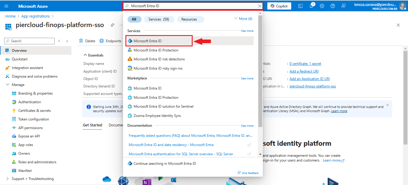 18. We need to add the AD groups to the created application (**piercloud-finops-platform-sso**). To do this, use the search bar to find **Microsoft Entra ID**. When you find it, click on the name that was searched, as illustrated in the image below.