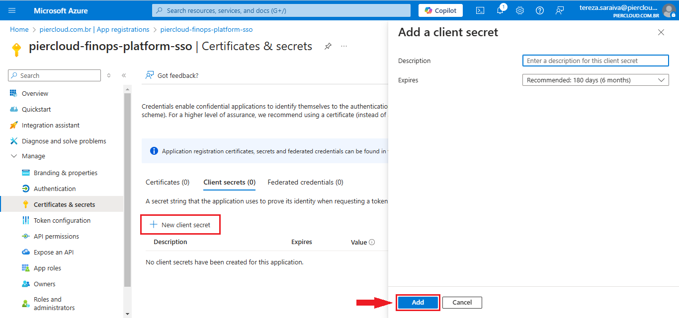 6. Click on the "**New client secret**" button. In the form on the side, click on the **Add** button: