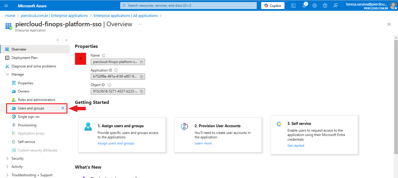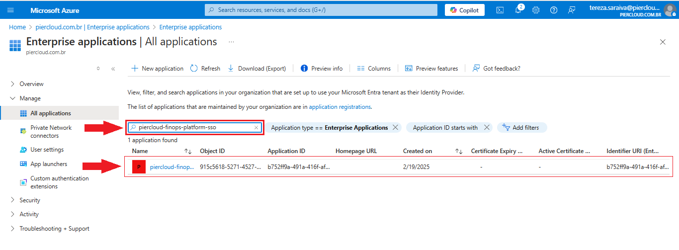 20. In this step, use the search field again to locate the application you created (in this case, **piercloud-finops-platform-sso**). Once you have found the desired application, click on its name, as illustrated in the image below.