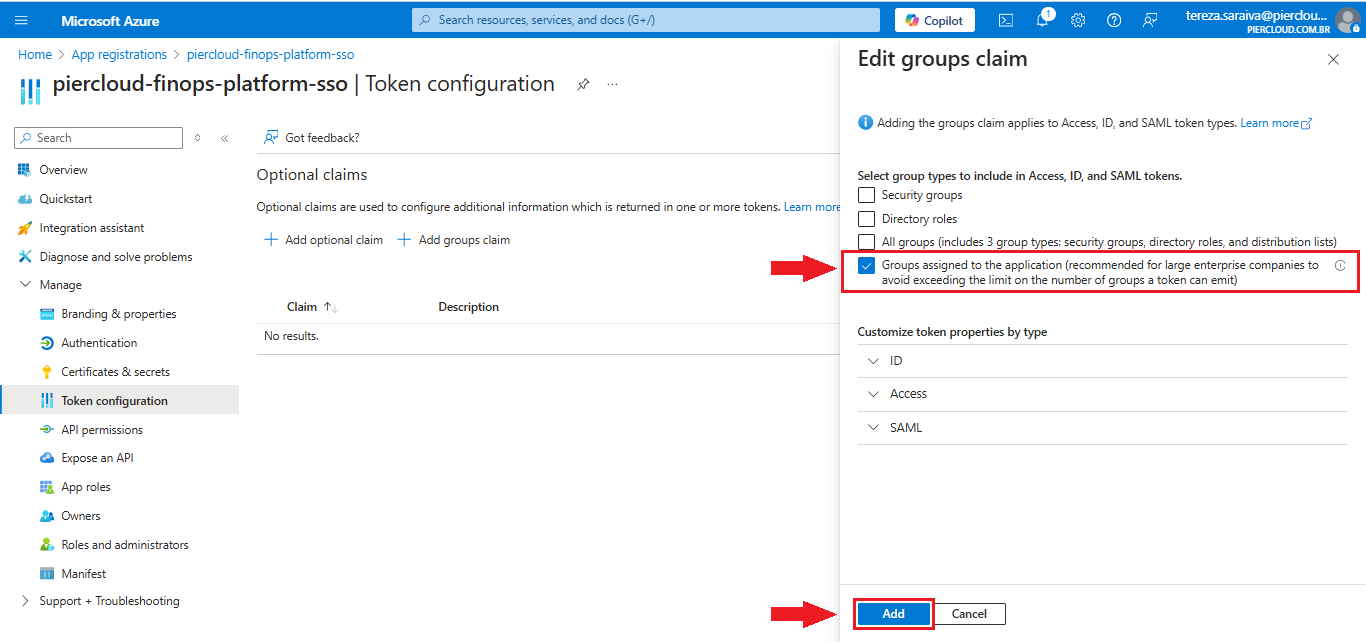 16. Click the "**Groups assigned to the application (recommended for large enterprise companies to avoid exceeding the limit on the number of groups a token can emit)**" checkbox, then click **Add**, as shown in the image below.