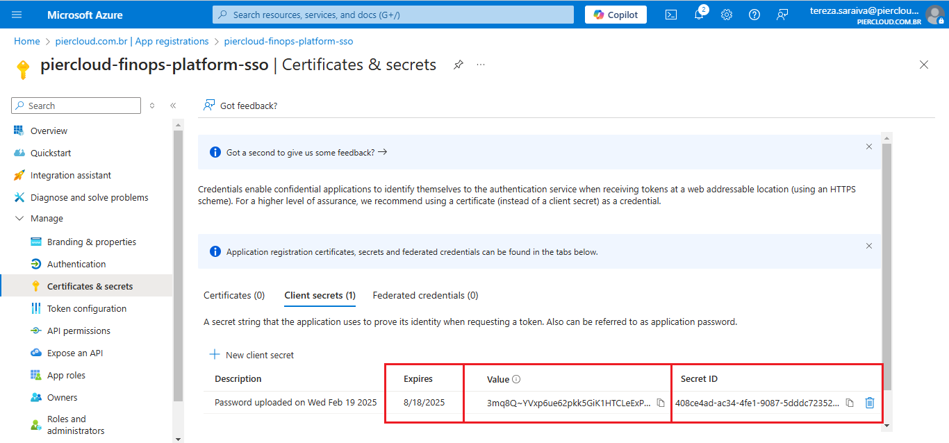7. Send the generated **Value, Secret ID** and **Expiration Date** to the PierCloud team: