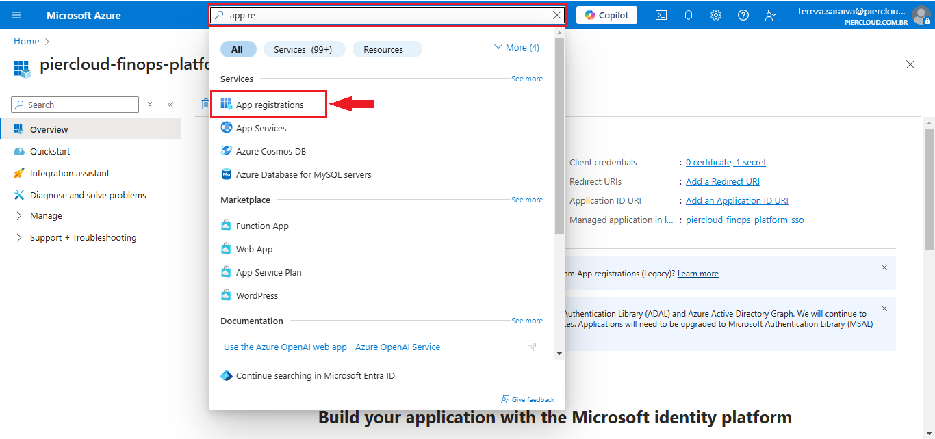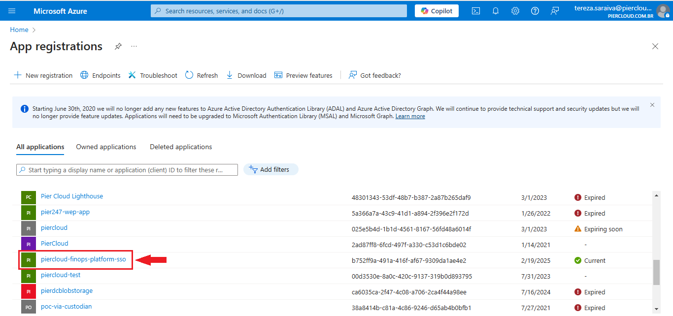 10. Here click on the created APP registration (in this case we will use an App created for testing "piercloud-finops-platform-sso") as illustrated in the image below.