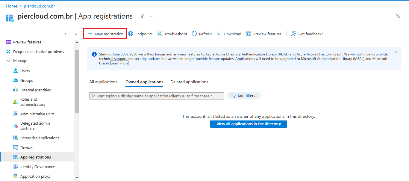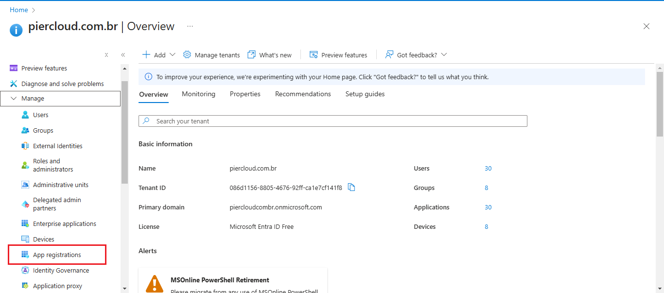 2. In the **Microsoft Entra ID** section, select the **App registrations** option in the side menu: