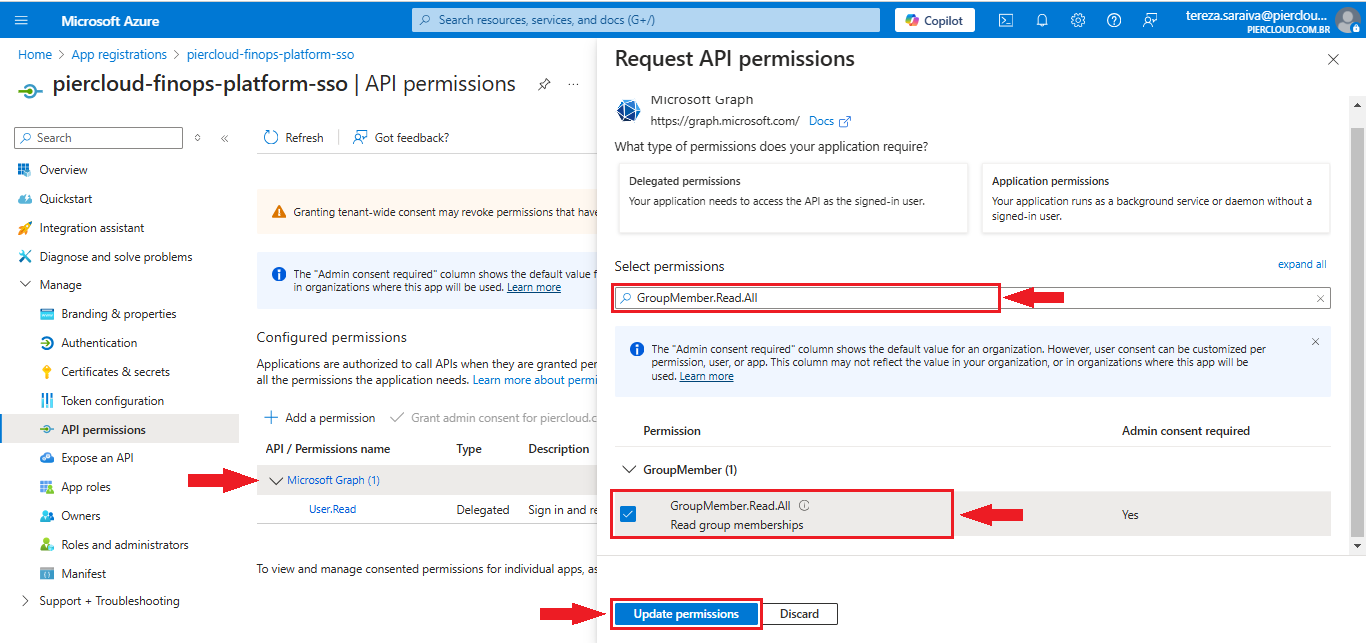 13. In this step, click on **Microsoft Graph** and a window will appear on the right. In the "Select permissions" field, look for **GroupMember.Read.All**. Then click on Update permissions, as shown in the image below: