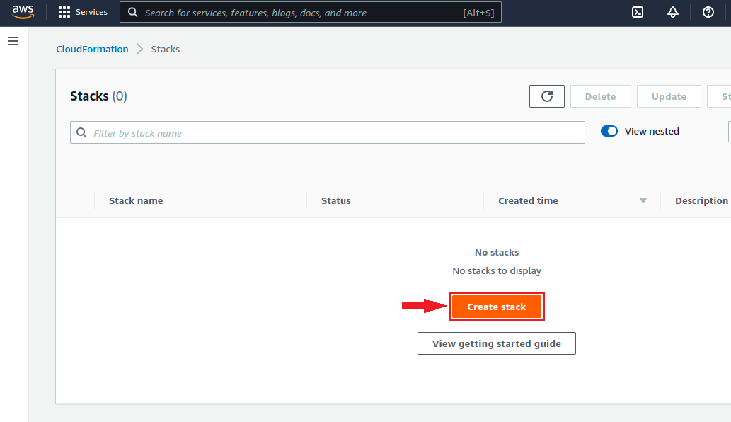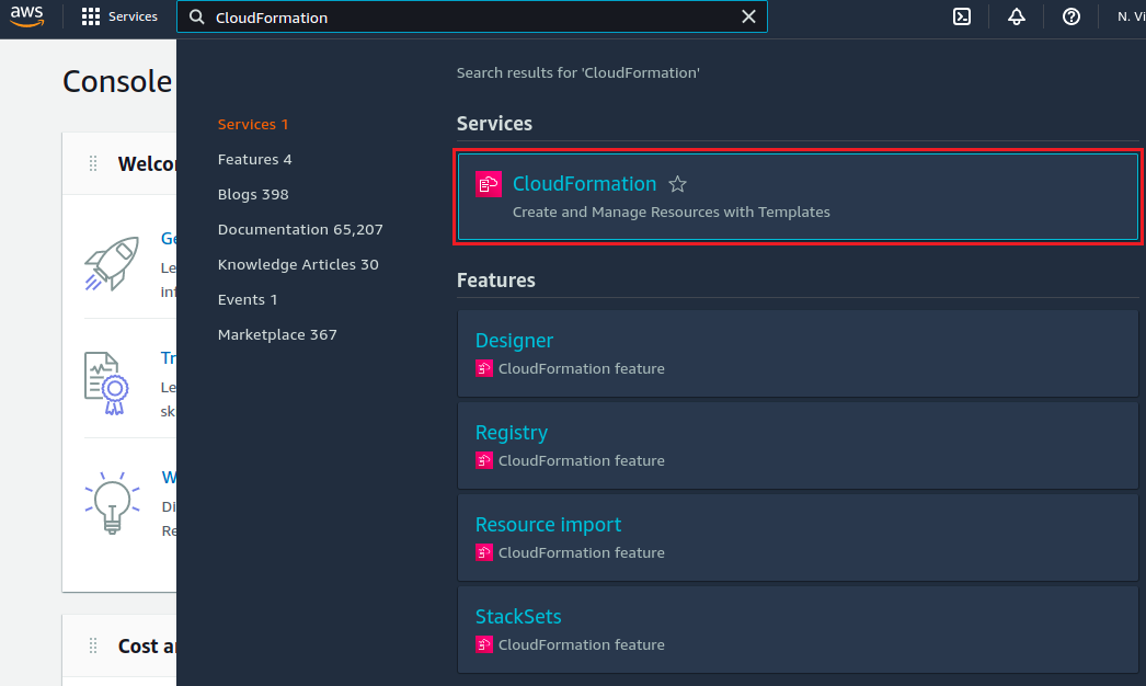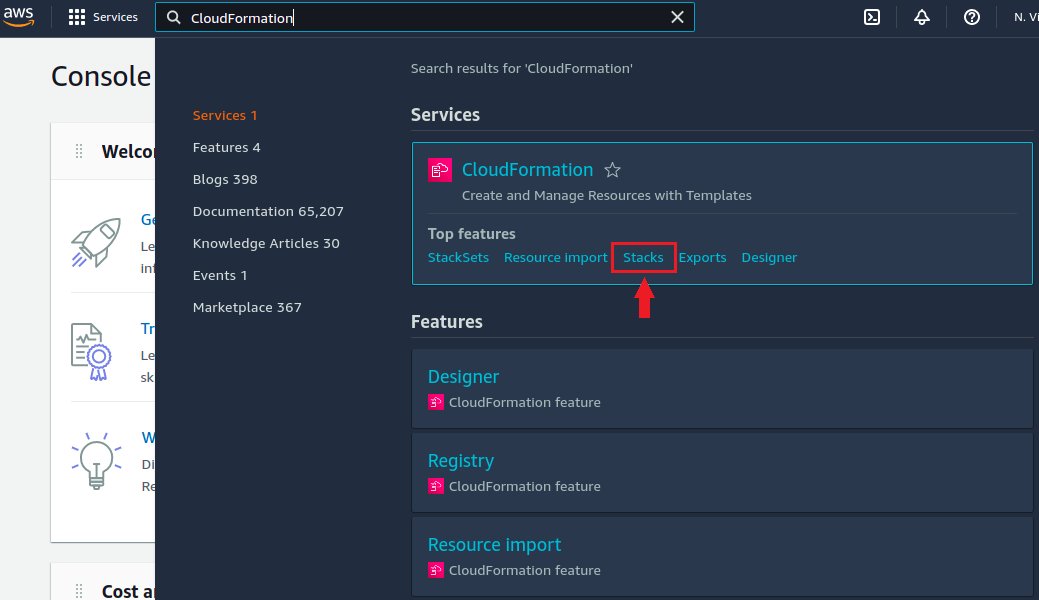1. In the Services menu, choose the **Cloud Formation** option.