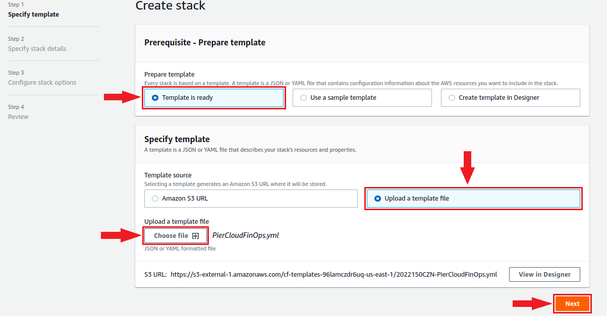 4. Choose the option: **Template is ready**, and then **Upload a template file**. Locate the **PierCloud.yml** file, downloaded from the platform in step 1 and after uploading the file click **Next**.