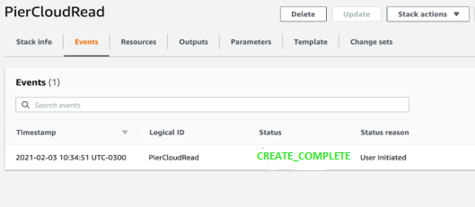7. Cloud Formation will start creating the PierCloud Role. After a few minutes you should see **CREATE\_COMPLETE** in the status column.