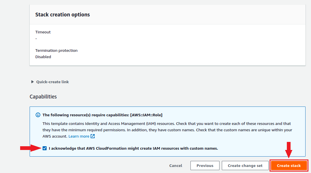 6. Click the **checkbox** to confirm the creation of the resource and then click **Create stack.**