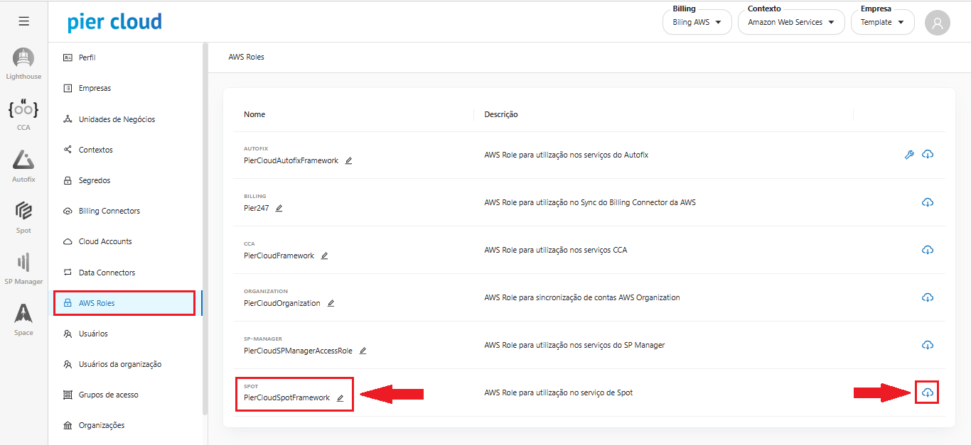 3. Here click on **AWS Roles**, in the bottom left menu, then find the role you want (in this case we will select **Spot-”Customer Name”**), then click on the icon in the bottom right corner, to download the role, as illustrated in the image below.