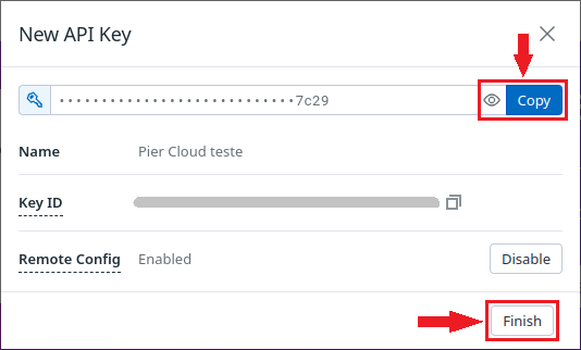 4.5. In this step, click on **Copy** to copy the key (paste it into a notepad), then click on **Finish** to complete the creation of the Application Keys.