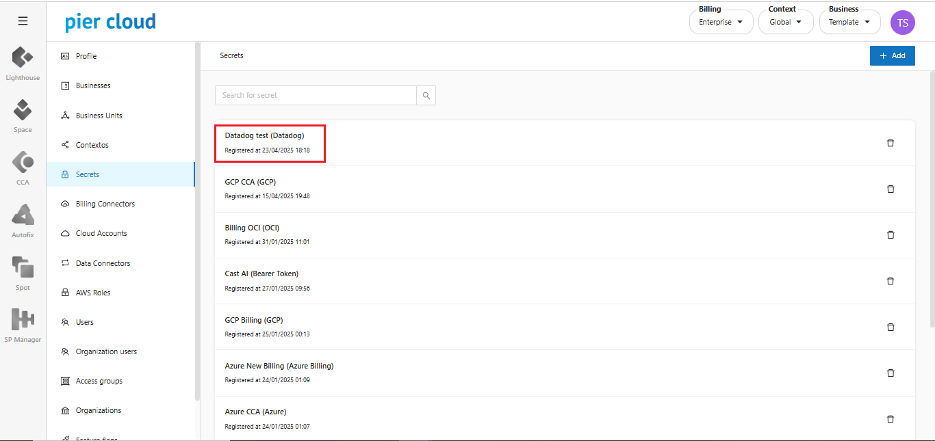 3. In this step, click on **+ Add** to insert the information created on the Datadog platform.