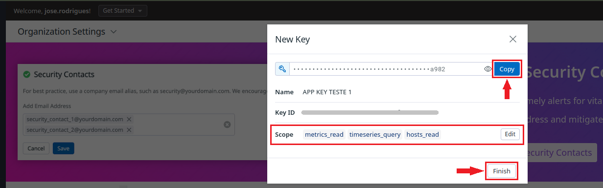 * Key generated in "**API Key**" in Datadog;