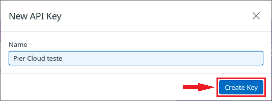 2.1. After clicking on **New Key**, a window will open to enter the name of the **API Key**, in this case the name Pier Cloud test was used (however, the name of the project, etc. can be added) then click on **Create Key**.