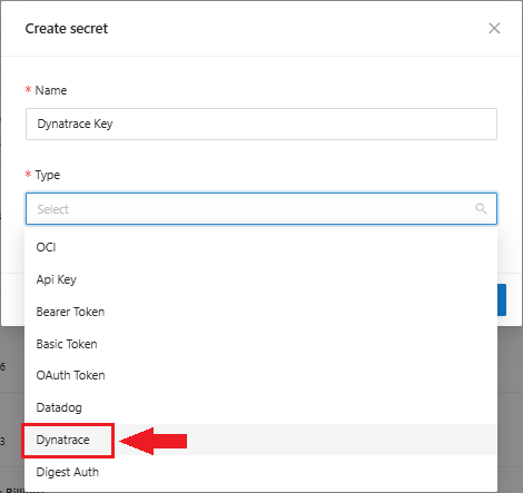 3. In this step we will configure the secret, in the **Name** field, we will add the name to identify the Secret, in the **Type** field we will select the type of secret, in this case we will select **Dynatrace**, as shown in the image below: