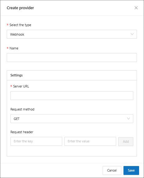 **Settings:** For the Webhook provider type, the following additional fields must be completed: