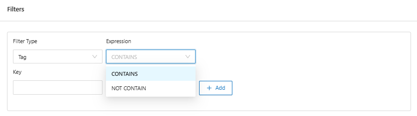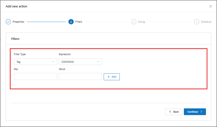 The filters are where Scheduled Scaling will locate resources by key and value. The system allows to consider only one type of resource, or exclude that resource from the list, considering the trigger rule as, for example, “Contains” and informing a Key and a Value.