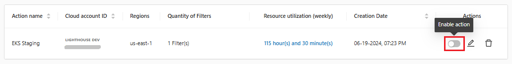 After the action creation is complete, the configuration is visible on the home screen, where it is possible to **turn off** the rule, **edit** and **delete** the created rule.