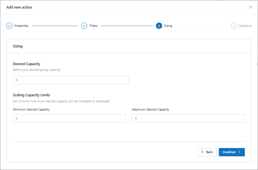 when clicking continue, the system will display the sizing screen where it is possible configure the initial capacity, determine a minimum and a maximum that it can scale, if necessary.