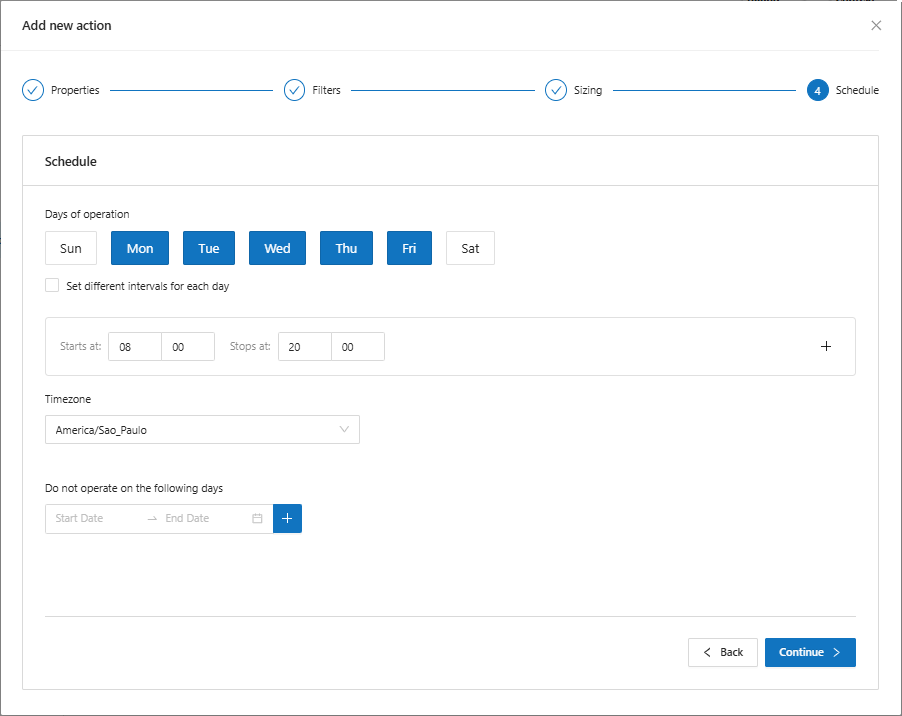 When clicking continue, the system will display the Schedule screen, where it is possible to set the days and periods in which this rule will work.