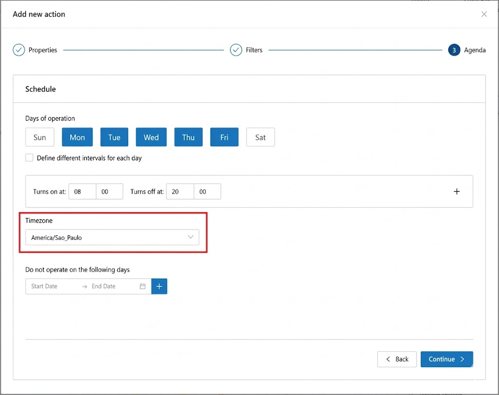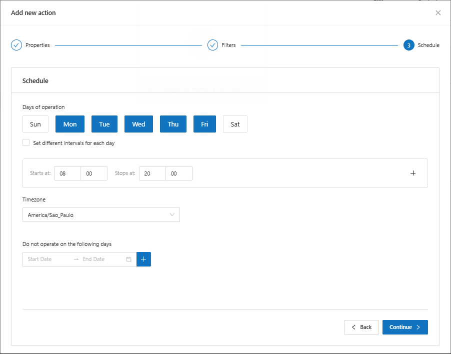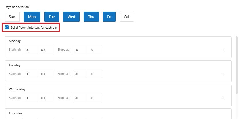* It is possible to define the days of the week when the resource will operate, as well as the time when the resource should be started and stopped.