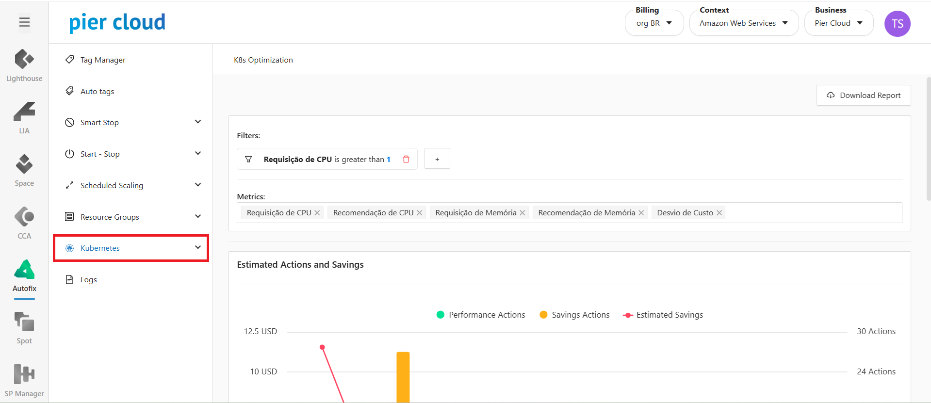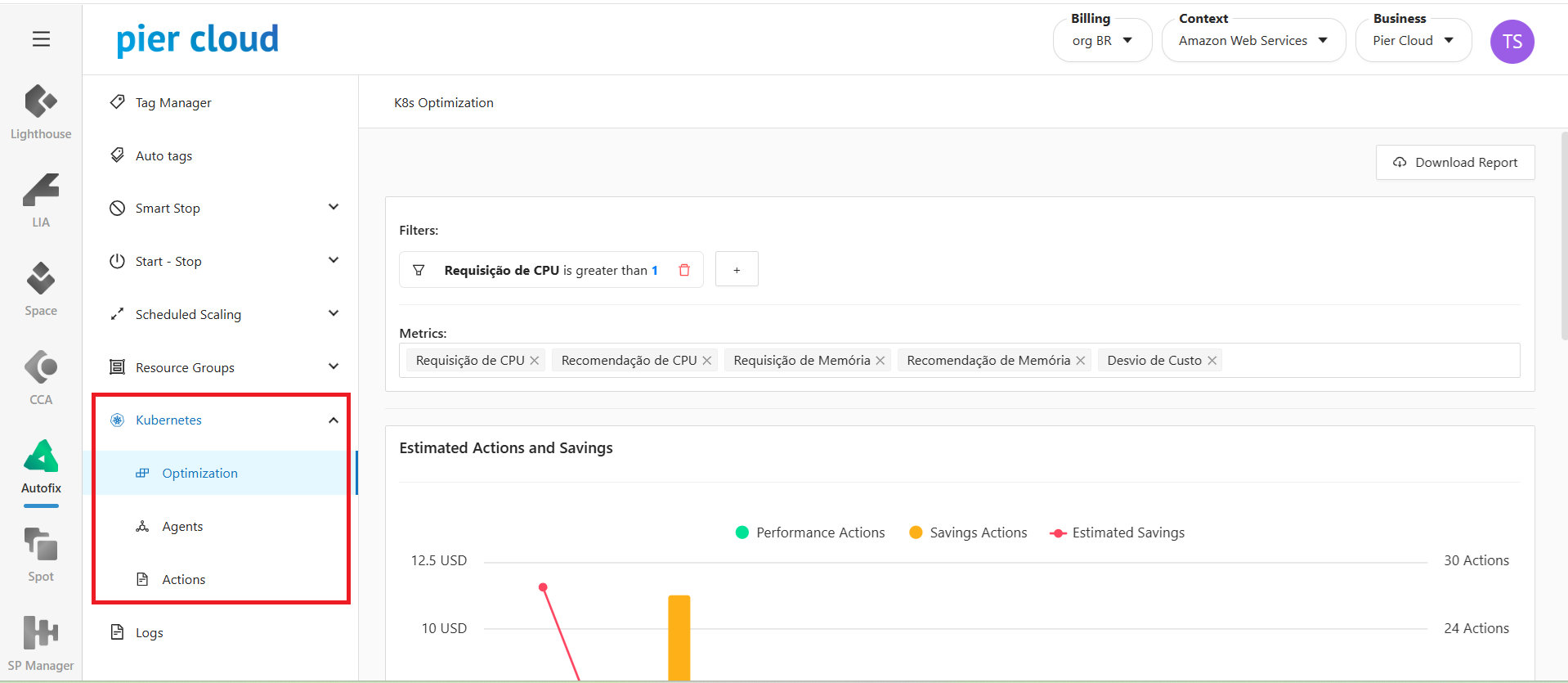 The Kubernetes functionality in Autofix makes it possible to enable cost optimization opportunities in workloads running on Kubernetes. Through an agent installed in the cluster, the system allows activating the optimization by automatically performing the recommended action.