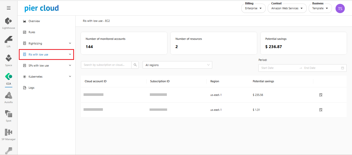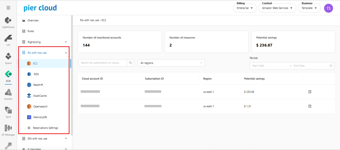 CCA functionality that monitors reserved instances that are with low use or idle. This functionality includes the following AWS services (EC2, RDS, Redshift, ElastiCache, Opensearch, Memory DB).