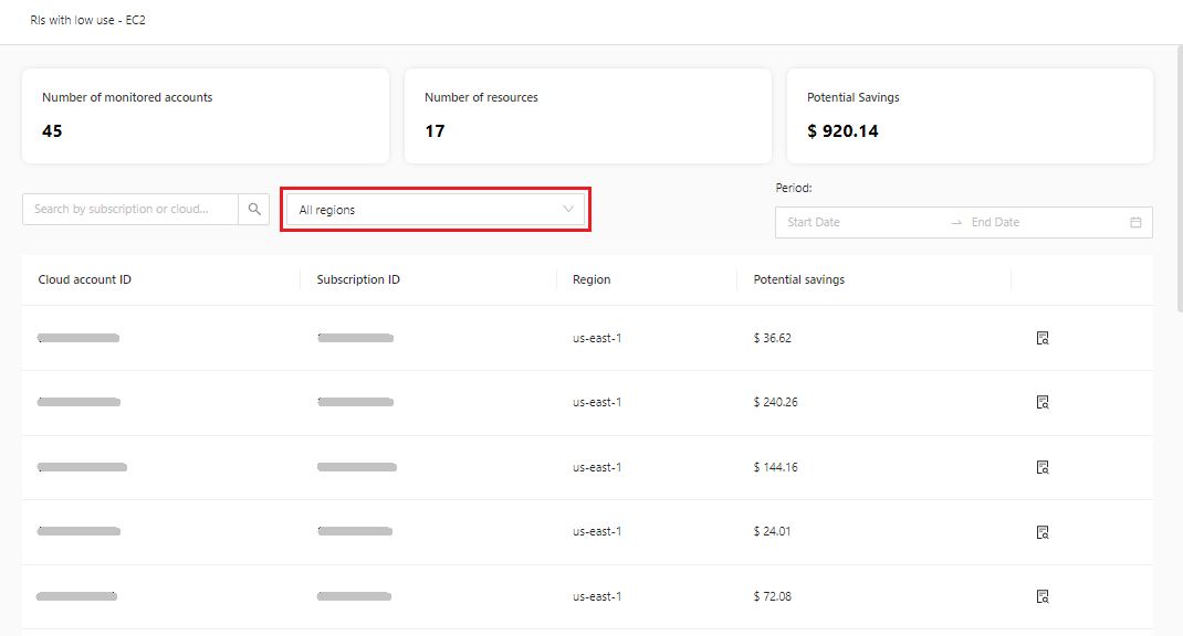 * In the selected filter, you can filter recommendations by **Subscription ID** or **Account ID**.