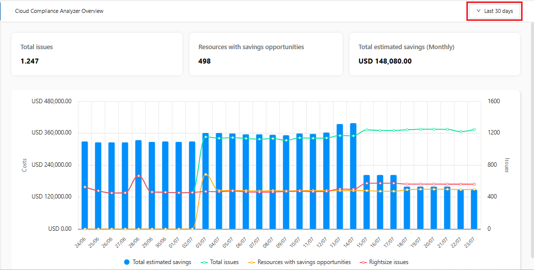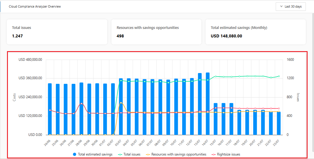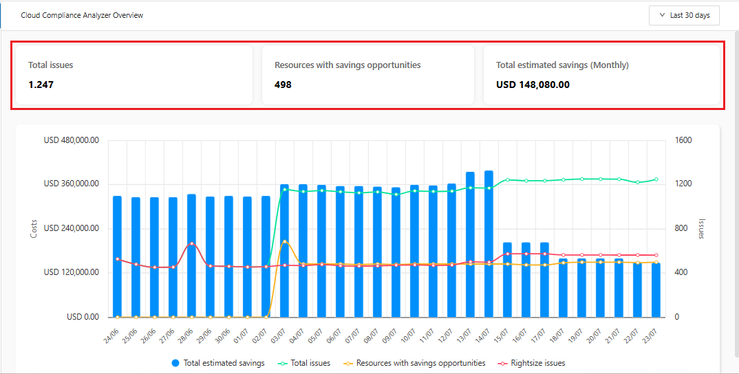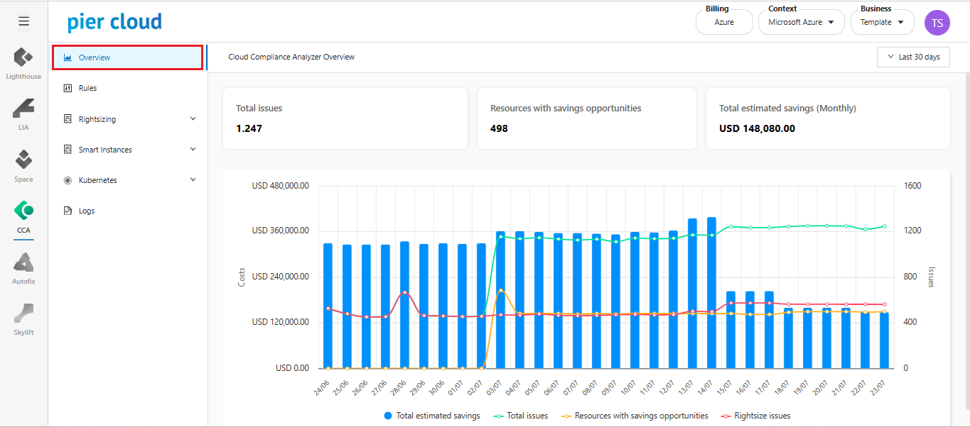 In the Overview, you can get a general view of the CCA analyses, such as the **total number of issues**, **resources with cost-saving opportunities**, and the **estimated (monthly) savings potential**. Below, we will explain each view in more detail.