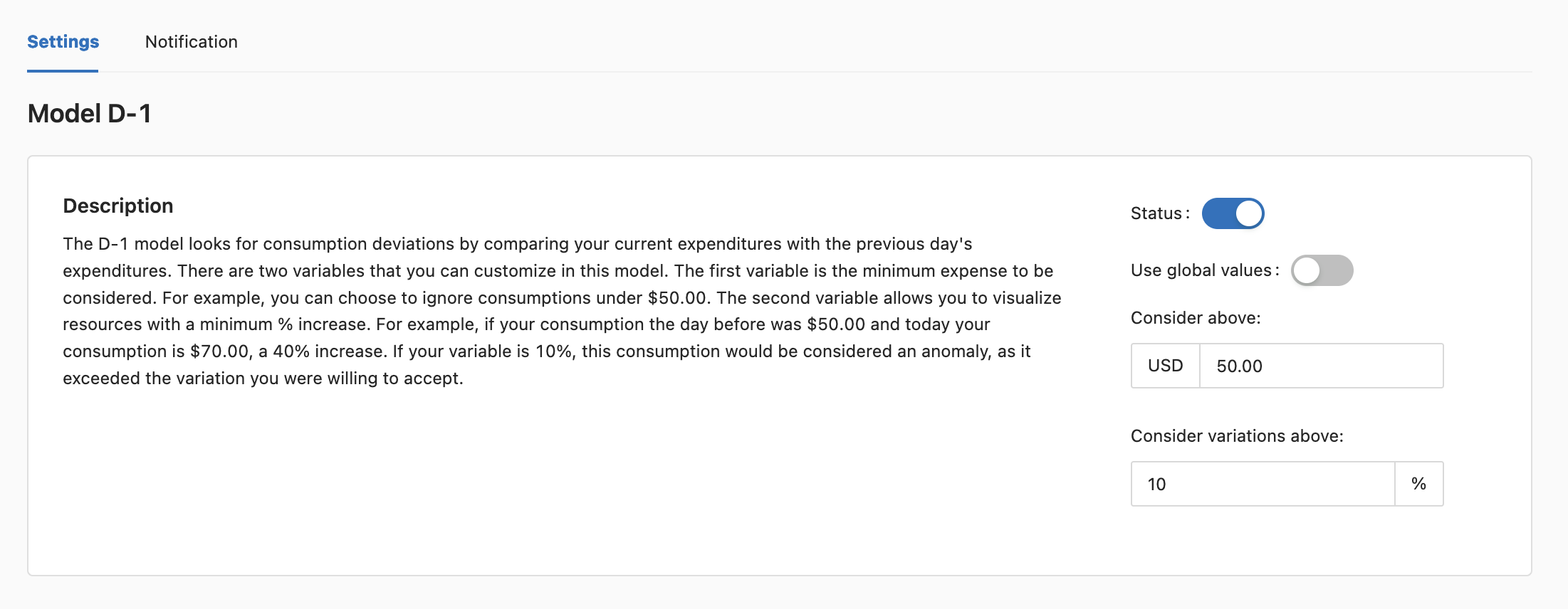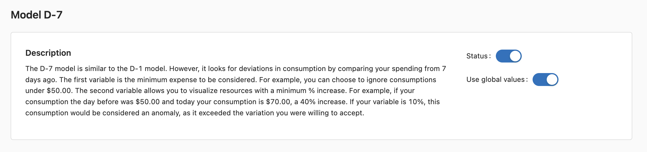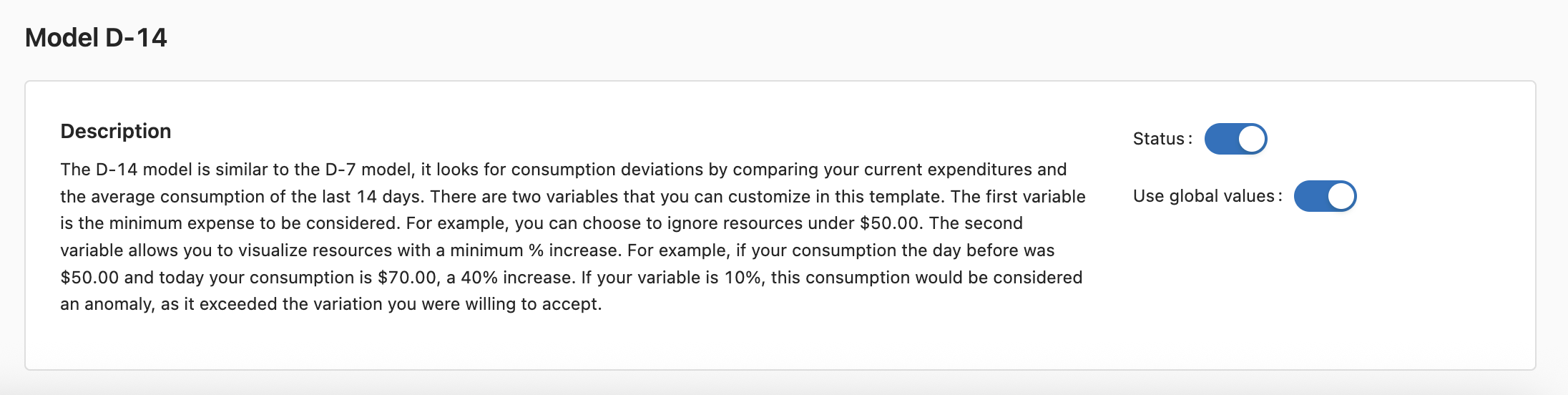 The model calculates the variation in consumption between the current date **(D0)** and the model date **(D-1, D-7 and D-14)** and checks whether the variation is above the value ($) or % configured in the model.