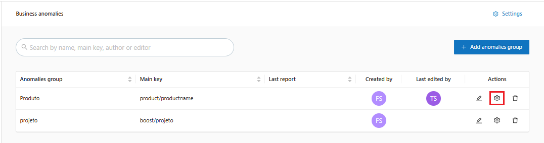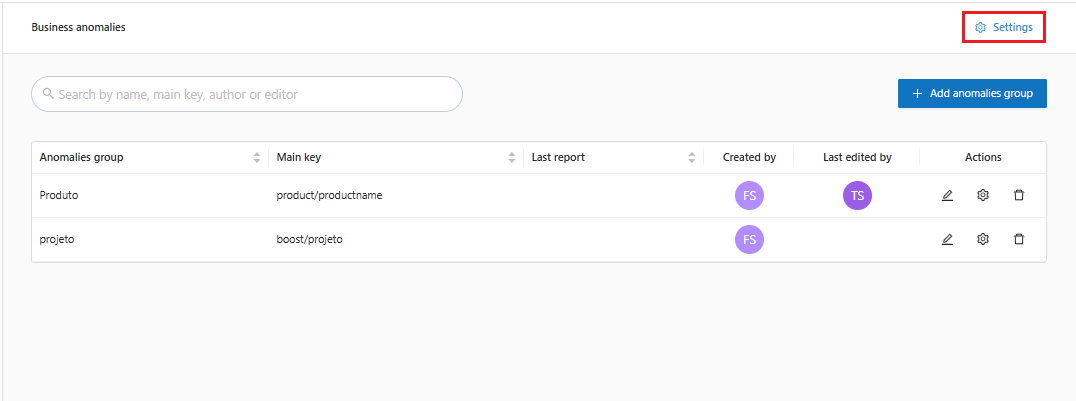 2. The system will open on the main **Business Anomalies** screen with the possibility of configurations, by clicking on the **"**![](https://1687673077-files.gitbook.io/~/files/v0/b/gitbook-x-prod.appspot.com/o/spaces%2FZ9sinLUl52lDK1vg6b8g%2Fuploads%2FCThyjrElsNpNsSG80Nbq%2Fimage.png?alt=media\&token=e30563df-7951-4ad8-9f60-d062cfe4b9c3)**"** icon, as highlighted below: