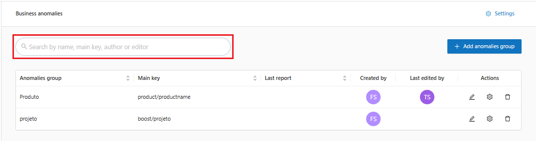 * In the **Anomaly Groups** list, the system allows you to search by **name, main key, author or editor**.
