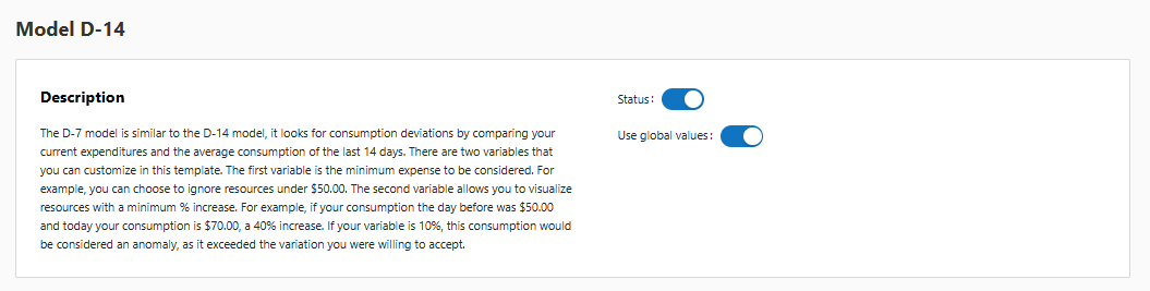 The model calculates the variation in consumption between the current date **(D0)** and the model date **(D-1, D-7 and D-14)** and checks if the variation is above the value ($) or % configured in the **global** model or in each of the models **by account**.