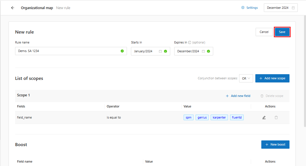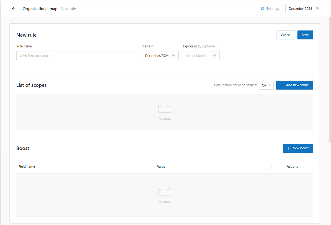 The system will display the rule addition screen divided into 3 parts: **New rule, Scope list and Boost**.