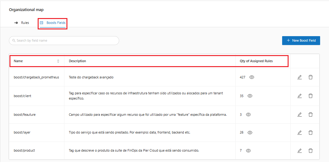 **Step 11**: Moving on to the **Boost Fields** tab, the system will list all the Boost fields created with their respective **name**, **description** and the **number of rules** that were assigned to the field.