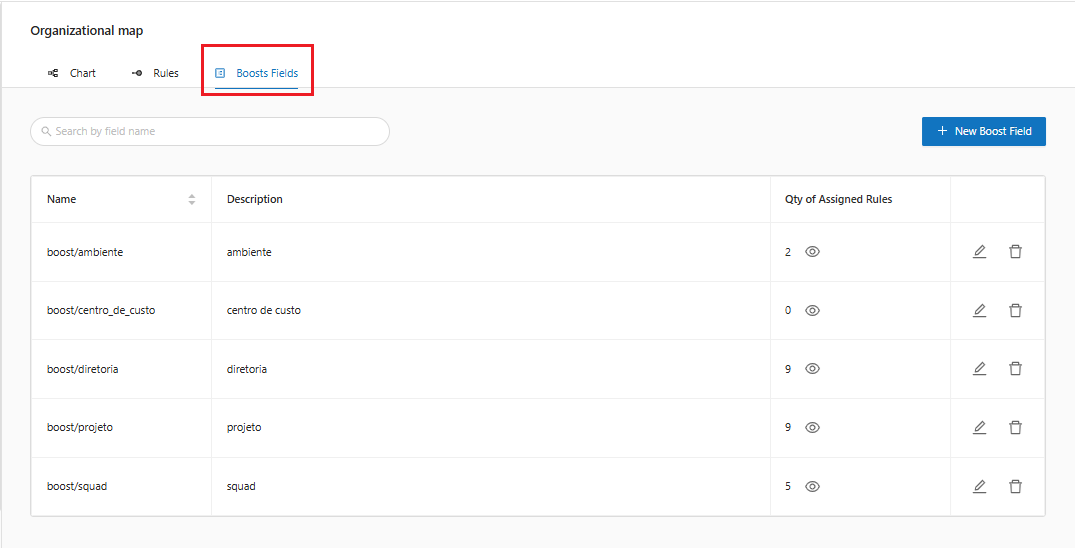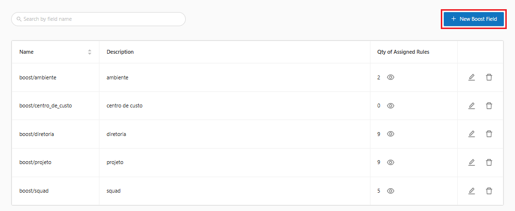 5. Finally, by clicking on the **save** button, the system will store the boost field and return to the main screen, on the Boost Fields tab, where you can view the registered field.