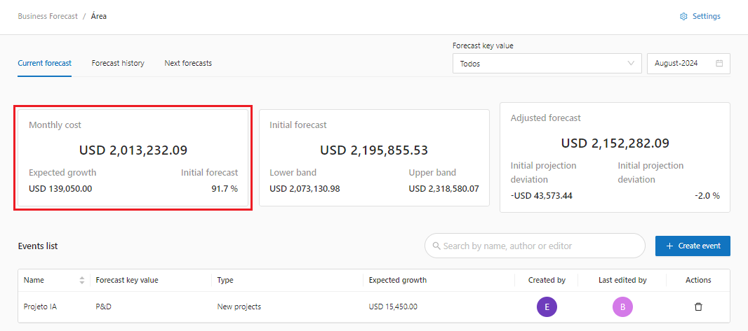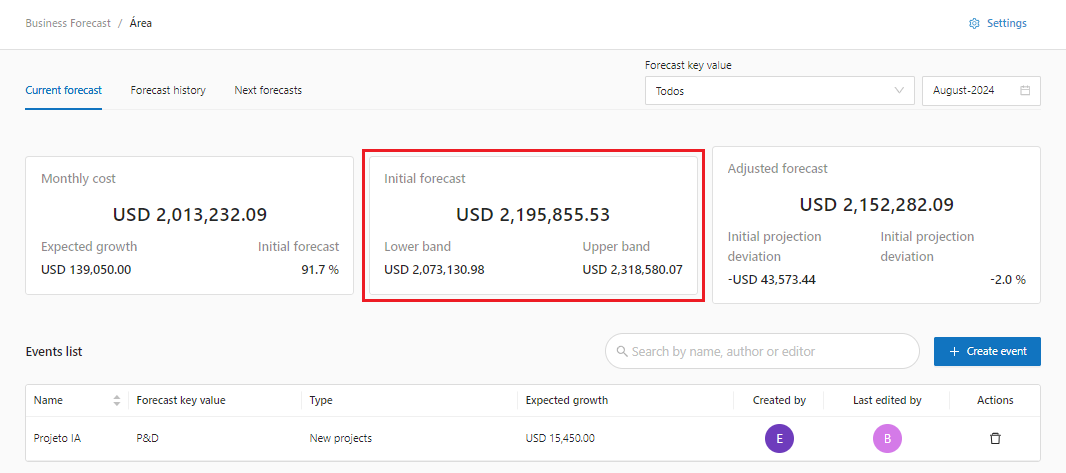 * **Initial Forecast**: Shows the forecast value for the selected competency, the value is calculated taking into account all the values ​​from past months, calculates seasonality and organic growth, always taking into account the **Events** created, in this case a **new project** of USD 15,450.00 will have an adjustment in the calculation, it is important to note that this value is calculated once on the first day of the month and does not change.