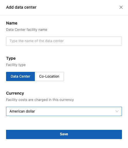 * **Type**: Specify whether the facility type refers to a standard Data Center or a Colocation, which applies when the company’s servers and IT equipment are hosted in a rented Data Center.