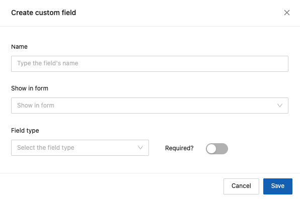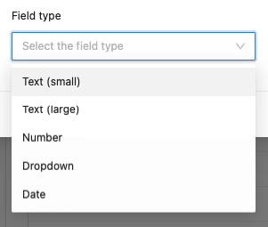 * **Field type**: Specify the input type for the field. Select one of the available options: Text (Small), Text (Large), Number, Dropdown, or Date.