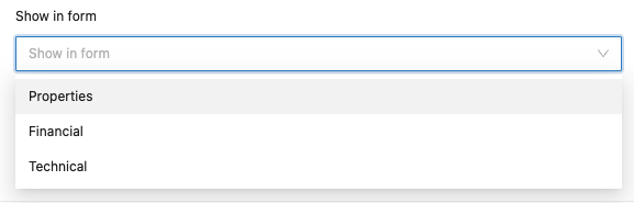 * **Show in form**: Specify where this field should be displayed in the form. Select one of the available options: Properties, Financial, or Technical.