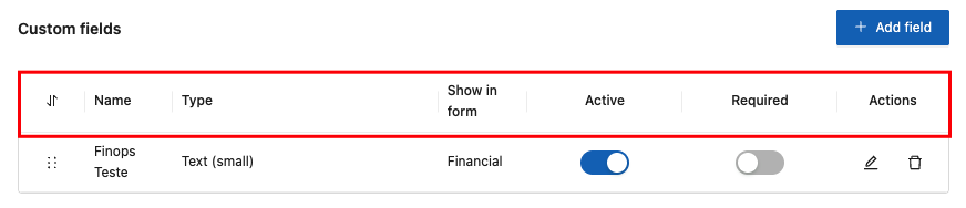 * **Active**: Indicates whether the field is active and allows you to change its status.
