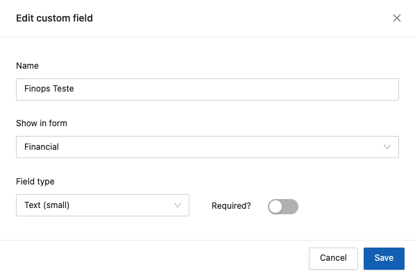 2. The system will display the screen to add new custom fields, where you must provide the following information: